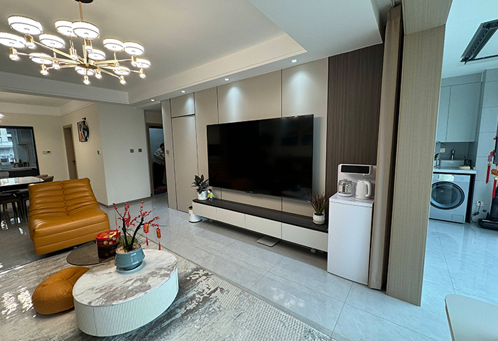 本案設(shè)計(jì)風(fēng)格為意式輕奢,拒絕了濃烈的色彩,以一種簡(jiǎn)單、純粹的設(shè)計(jì)語(yǔ)言,回歸生活的本質(zhì),留存給居住者更多生活想象的空間。 整體空間灰橙色、駝色、與淺暖灰色調(diào)展現(xiàn)輕奢低調(diào)的高級(jí)質(zhì)感,簡(jiǎn)約時(shí)尚的家具又增添了一份現(xiàn)代感,重新梳理了空間功能和尺寸,客廳陽(yáng)臺(tái)一體化設(shè)計(jì),最大限度引入自然光,高級(jí)灰搭配中性色系木飾面,打造一個(gè)舒適的高品質(zhì)空間。在空間設(shè)計(jì)與色彩配搭上,精準(zhǔn)地把控節(jié)奏,用設(shè)計(jì)表達(dá)空間的包容性,更多的是通過人性化思考,創(chuàng)造一個(gè)功能性完整的舒適生活空間。大塊的木飾面、金屬元素和燈 光的碰撞搭配,凸顯出強(qiáng)大張力,共同打造出意式輕奢腔調(diào)十足的時(shí)尚與質(zhì)感。