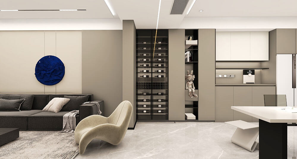 客廳方面,電視墻采用護墻板和隔柵拼色設計,沒有傳統(tǒng)的主燈吊頂。背景墻采用護墻板進行拼色處理,與酒柜和護墻板顏色相呼應。沙發(fā)的色系與護墻板的顏色深淺相間,營造出層次感。