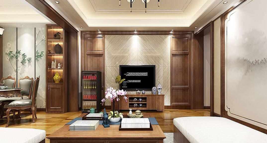 根據(jù)業(yè)主喜歡的木色搭配裝飾顏色和造型,打破中式沉悶黑暗的氛圍。運(yùn)用中式元素和新材料相結(jié)合,整體賞心悅目。