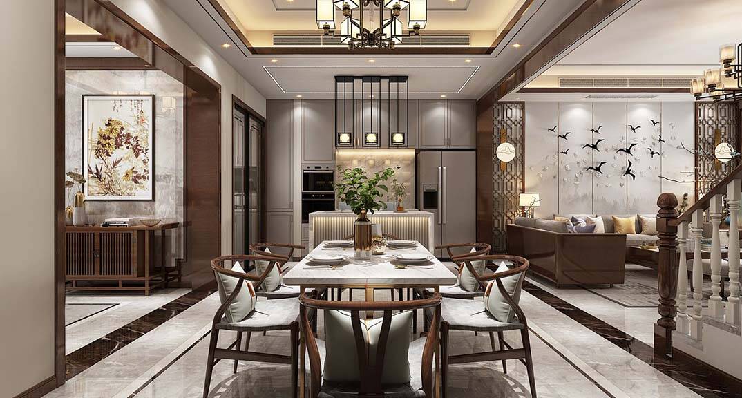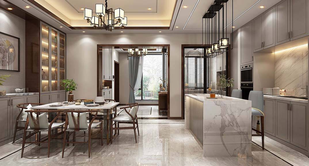 每個家庭的裝修中都需要擁有功能性的設(shè)計,這也是一個家居裝修中最主要的目的。新中式風(fēng)格的設(shè)計理念也體現(xiàn)出了功能性的設(shè)計。比如西餐廳加入大理石島臺的設(shè)計,既體現(xiàn)其視覺上的美感,又具有實用性。