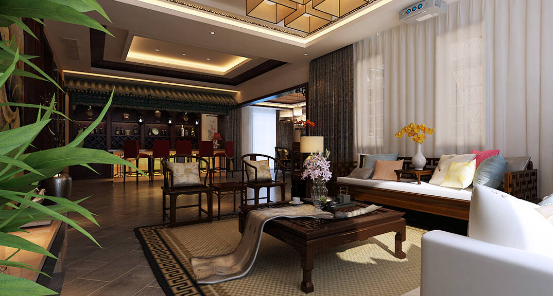 龍湖滟瀾海岸187㎡別墅客廳吧臺新中式風(fēng)格裝修案例效果圖