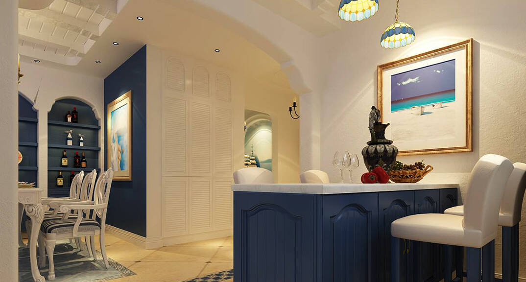 本案是一套別墅戶型,客戶非常喜歡大海的感覺希望把愛琴海的那種浪漫留在自己的心里。此案例運用了地中海特色的藍色調(diào),從入戶玄關(guān)造型以及埡口造型都運用了摸弧的造型地面地磚運用了小磚加拼圖的感覺,客廳客戶喜歡大氣簡單的效果把一些地中海的裝飾品加以運用體現(xiàn)出地中海的小情調(diào)仿佛置身在其中。