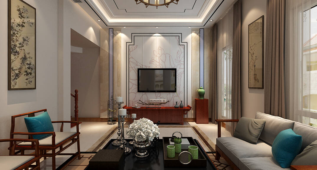 百通·香溪庭院180㎡別墅客廳電視中式風(fēng)格裝修案例效果圖