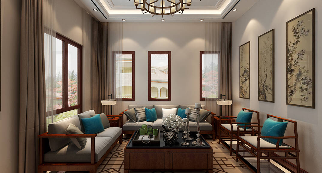 百通·香溪庭院180㎡別墅客廳沙發(fā)中式風(fēng)格裝修案例效果圖