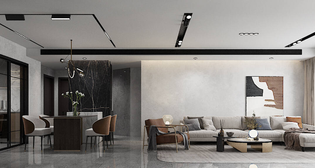 海爾世紀(jì)公館150㎡平層客餐廳現(xiàn)代極簡風(fēng)格裝修案例效果圖