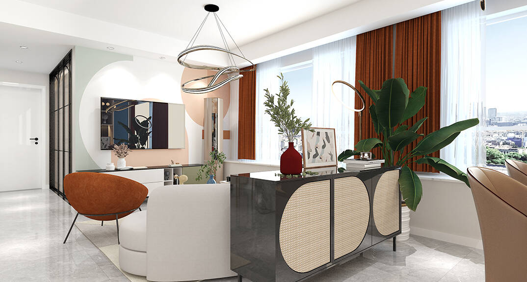 本案整體以現(xiàn)代中式風(fēng)格為主,既有現(xiàn)代風(fēng)格簡約、明朗的線條,又有中國傳統(tǒng)內(nèi)涵與韻味。墻面大面積使用暖色烘托整體氛圍,融洽中式與現(xiàn)代簡約兩種風(fēng)格??臻g更寬闊舒適玄關(guān)收納、玄關(guān)與干區(qū)相結(jié)合,既解放的外衛(wèi)的空間客廳電視背景是一面裝飾柜,豐富了空間,增加了收納和儲物,美觀又實用。