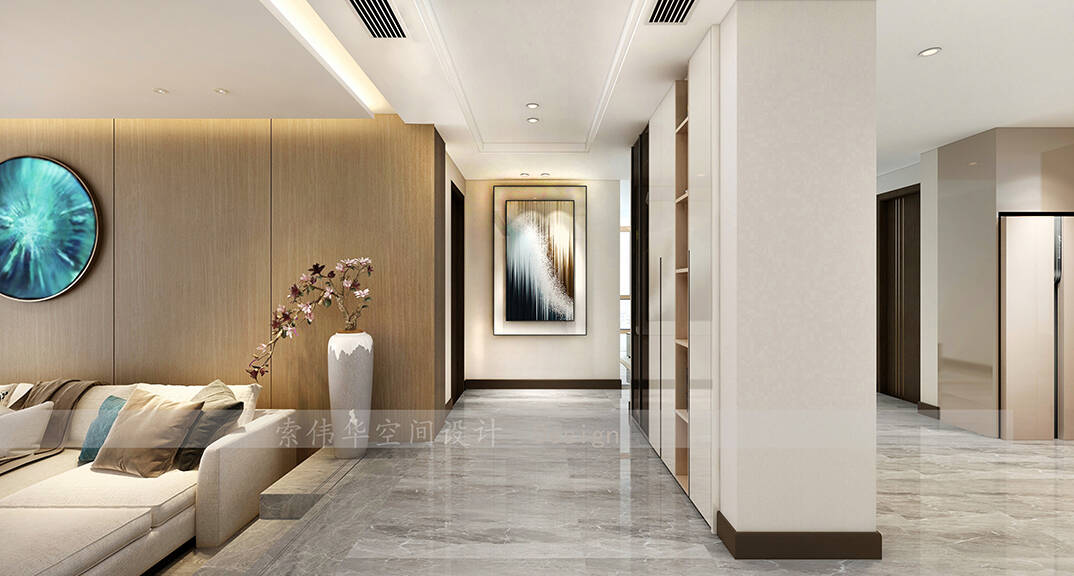 本案整體以現(xiàn)代中式風格為主,既有現(xiàn)代風格簡約、明朗的線條,又有中國傳統(tǒng)內(nèi)涵與韻味。墻面大面積使用暖色烘托整體氛圍,融洽中式與現(xiàn)代簡約兩種風格??臻g更寬闊舒適玄關(guān)收納、玄關(guān)與干區(qū)相結(jié)合,既解放的外衛(wèi)的空間客廳電視背景是一面裝飾柜,豐富了空間,增加了收納和儲物,美觀又實用。