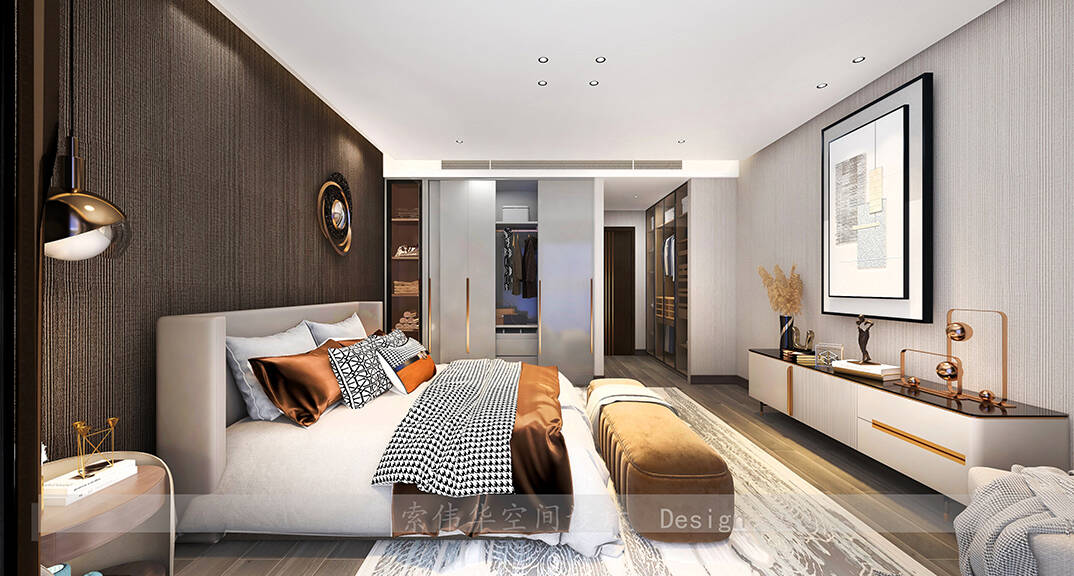 本案設(shè)計風格為意式輕奢,拒絕了濃烈的色彩,以一種簡單、純粹的設(shè)計語言,回歸生活的本質(zhì),留存給居住者更多生活想象的空間。 整體空間灰橙色、駝色、與淺暖灰色調(diào)展現(xiàn)輕奢低調(diào)的高級質(zhì)感,簡約時尚的家具又增添了一份現(xiàn)代感,重新梳理了空間功能和尺寸,客廳陽臺一體化設(shè)計,最大限度引入自然光,高級灰搭配中性色系木飾面,打造一個舒適的高品質(zhì)空間。在空間設(shè)計與色彩配搭上,精準地把控節(jié)奏,用設(shè)計表達空間的包容性,更多的是通過人性化思考,創(chuàng)造一個功能性完整的舒適生活空間。大塊的木飾面、金屬元素和燈 光的碰撞搭配,凸顯出強大張力,共同打造出意式輕奢腔調(diào)十足的時尚與質(zhì)感。