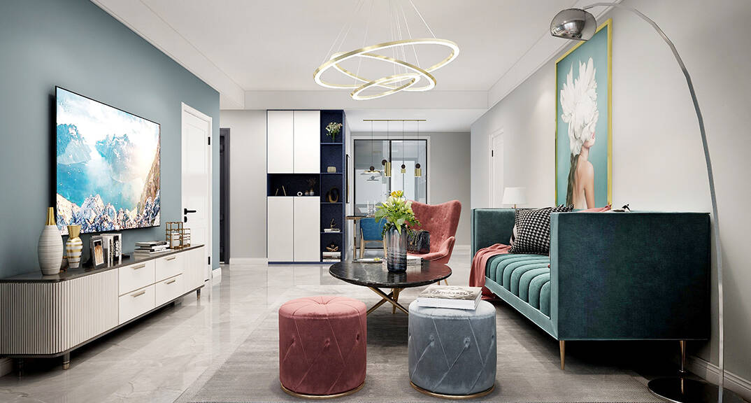 膠州機場公寓118㎡三室一廳客廳現(xiàn)代風格裝修案例效果圖