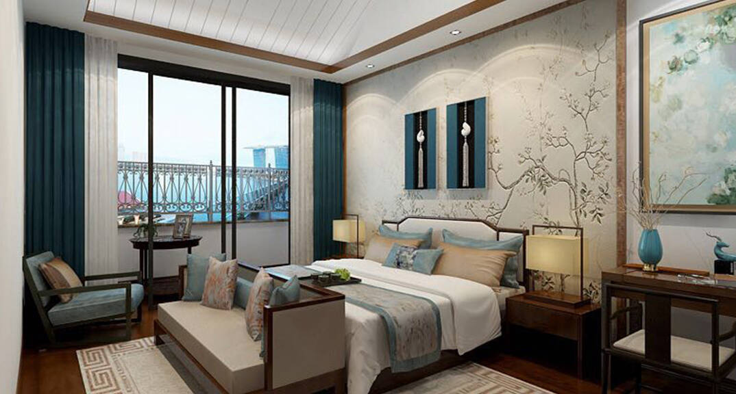 海川泓久山墅635㎡別墅臥室新中式風(fēng)格裝修案例效果圖