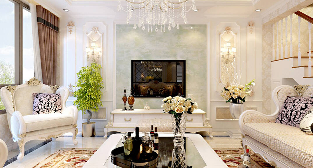中海臨安府160m2別墅上疊一層客廳電視背景墻法式風(fēng)格裝修案例效果圖
