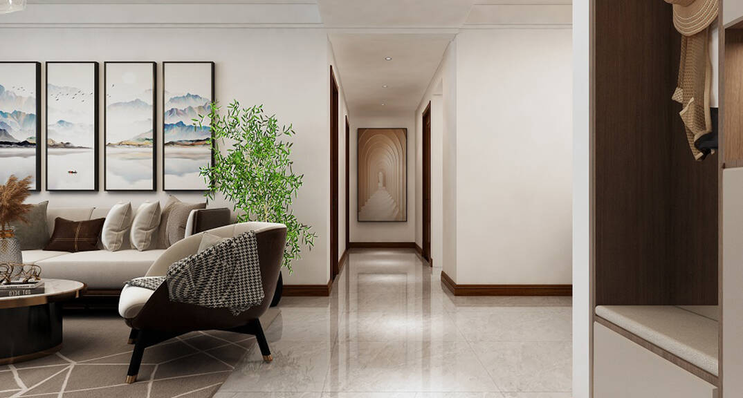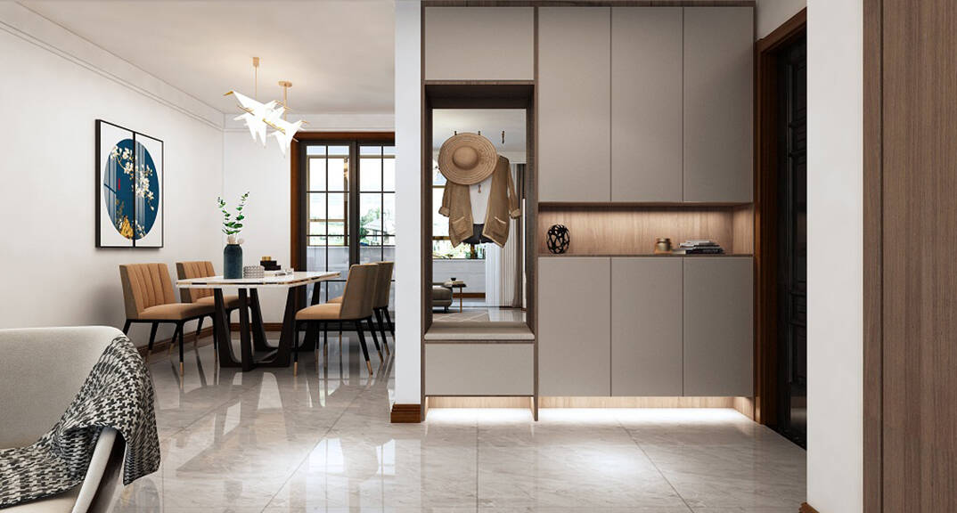 本案整體以現(xiàn)代中式風(fēng)格為主,既有現(xiàn)代風(fēng)格簡約、明朗的線條,又有中國傳統(tǒng)內(nèi)涵與韻味。墻面大面積使用暖色烘托整體氛圍,融洽中式與現(xiàn)代簡約兩種風(fēng)格??臻g更寬闊舒適玄關(guān)收納、玄關(guān)與干區(qū)相結(jié)合,既解放的外衛(wèi)的空間客廳電視背景是一面裝飾柜,豐富了空間,增加了收納和儲物,美觀又實(shí)用。