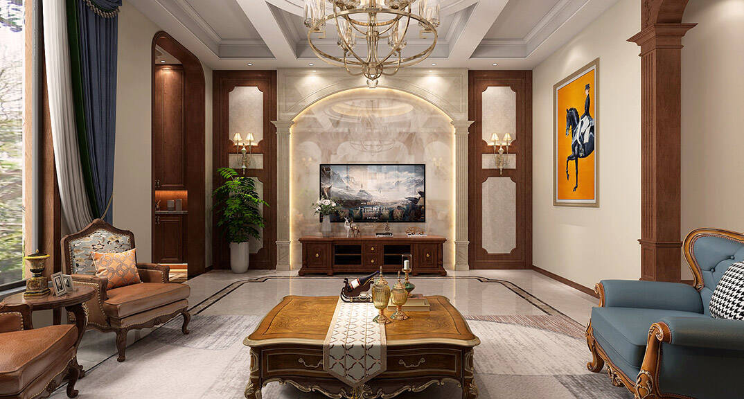 闞濟浪長水山莊238平別墅歐式風格客廳電視墻裝修效果圖