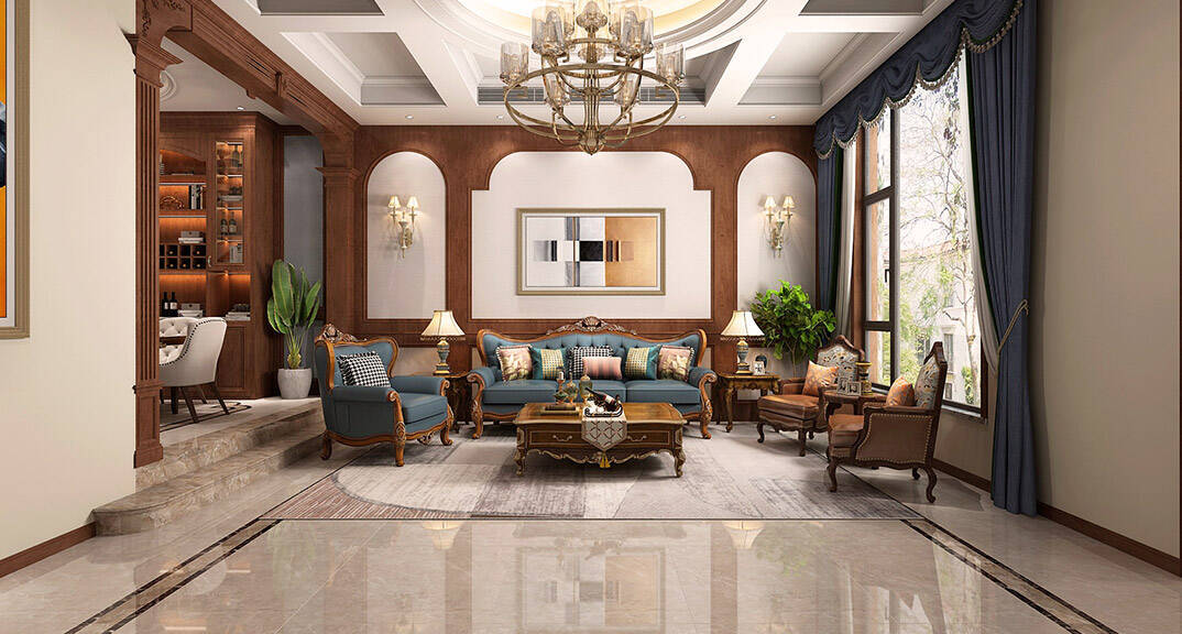 闞濟浪長水山莊238平別墅歐式風格沙發(fā)及背景墻裝修效果圖