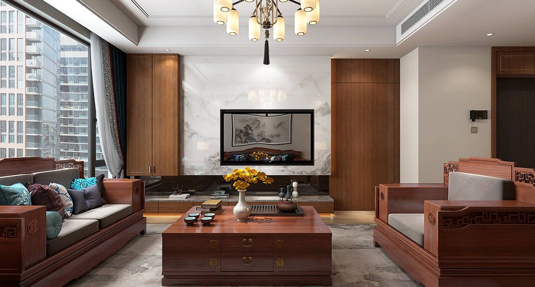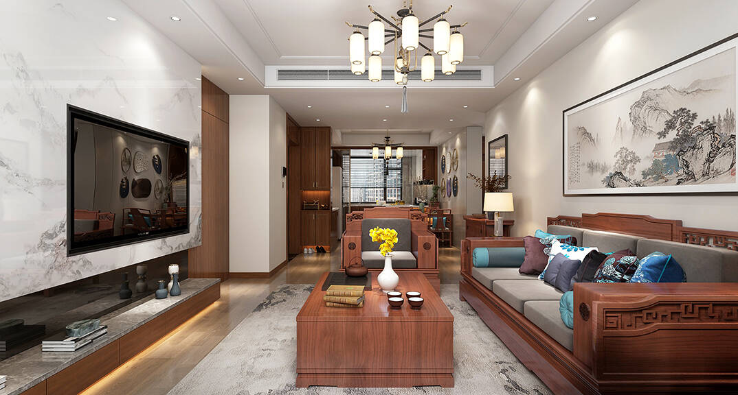 綠城·海棠印月131㎡三室一廳客廳新中式風(fēng)格裝修案例效果圖