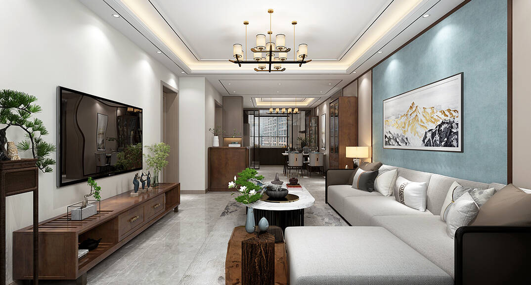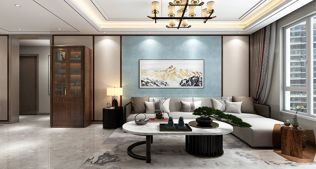 海棠印月131㎡三室一廳客廳新中式輕奢風(fēng)格裝修案例效果圖
