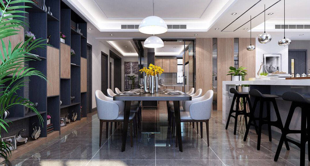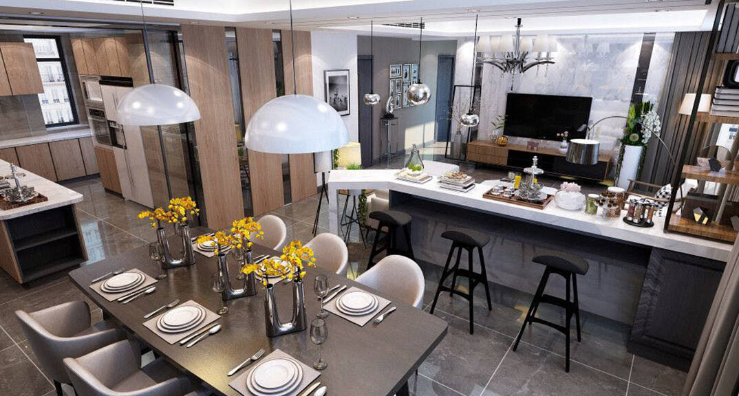 客餐廳以黑、灰、白作為現(xiàn)代空間的三線基調(diào),展現(xiàn)獨(dú)一無二的時(shí)尚簡練風(fēng)格,帶出內(nèi)斂低調(diào)的現(xiàn)代中式質(zhì)感,以躍層空間的實(shí)用性,創(chuàng)造出高低變化的豐富景色,這就是現(xiàn)代港式設(shè)計(jì)的精髓。
