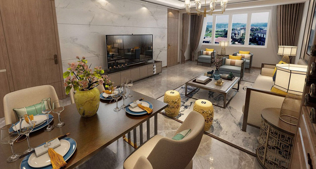 恩馬文景園144㎡二室一廳客餐廳沙發(fā)新中式風(fēng)格裝修效果圖