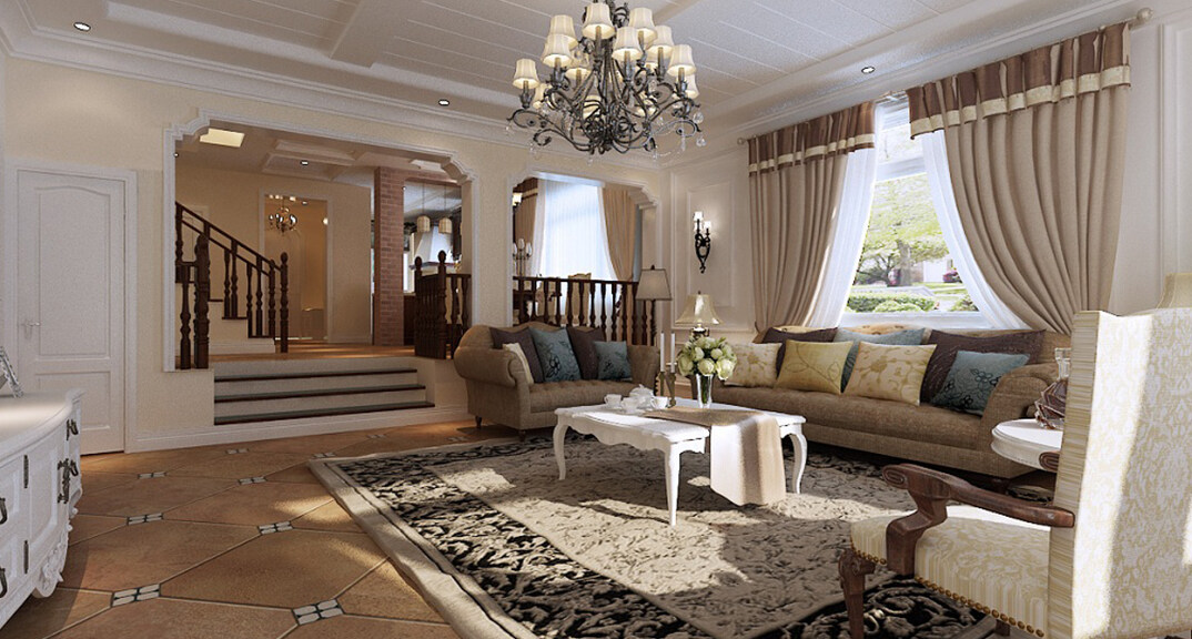 香溪庭院330㎡別墅一層客廳歐式田園風(fēng)格裝修案例效果圖