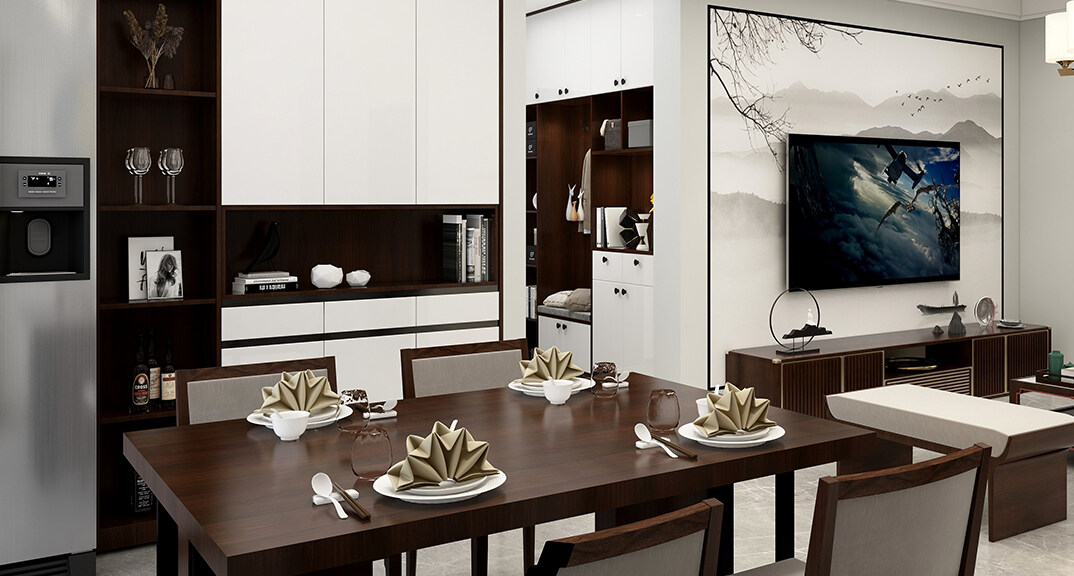 青安·海悅居86㎡二室二廳客餐廳新中式風(fēng)格裝修案例效果圖