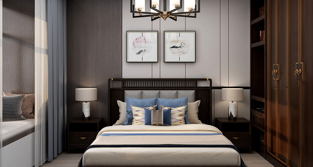 青安·海悅居86㎡二室二廳主臥新中式風(fēng)格裝修案例效果圖