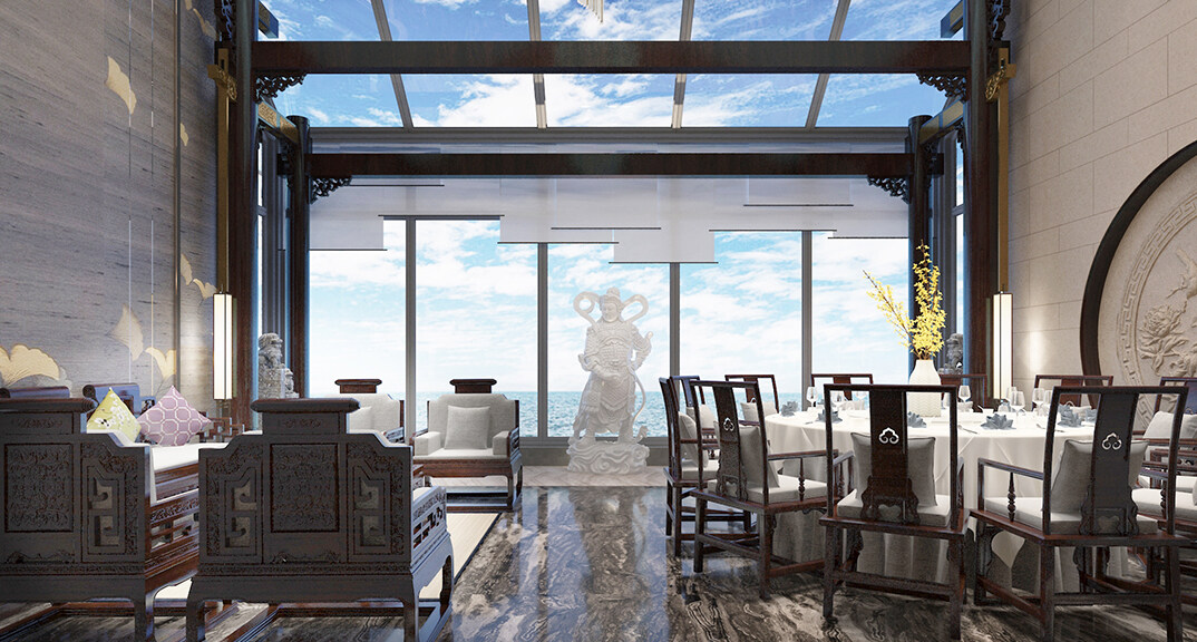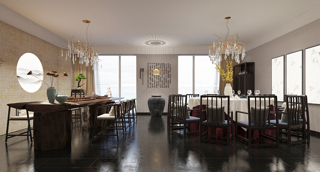 東海路700㎡獨(dú)棟別墅三層會(huì)餐廳新中式風(fēng)格裝修案例效果圖