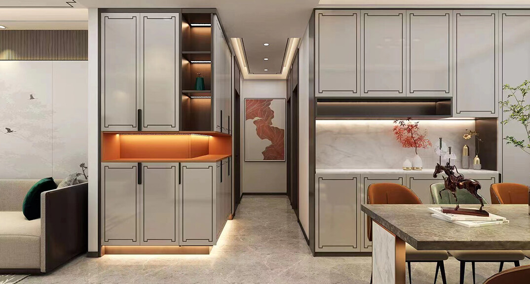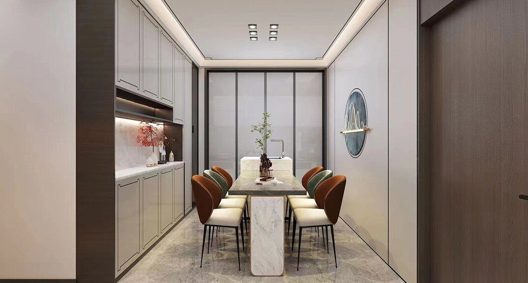 新中式,完美詮釋東方簡潔極致美感!本案設(shè)計根據(jù)客戶需求定位為新中式風(fēng)格。新中式風(fēng)格注重的是功能性與時尚性的完美結(jié)合,滿足功能性的情況下又能夠傳達(dá)給人一種自身的時尚優(yōu)雅品味與文化情懷,現(xiàn)代人的學(xué)習(xí)工作都講求快捷、高效,在生活娛樂時就希望把腳步放慢,回歸到輕快放松的自然環(huán)境中。本案在選擇室內(nèi)軟裝飾的時候大多選擇金屬材質(zhì)、時尚元素相結(jié)合的飾品,看上去格調(diào)高雅,并且給人一種身心放松的感覺。