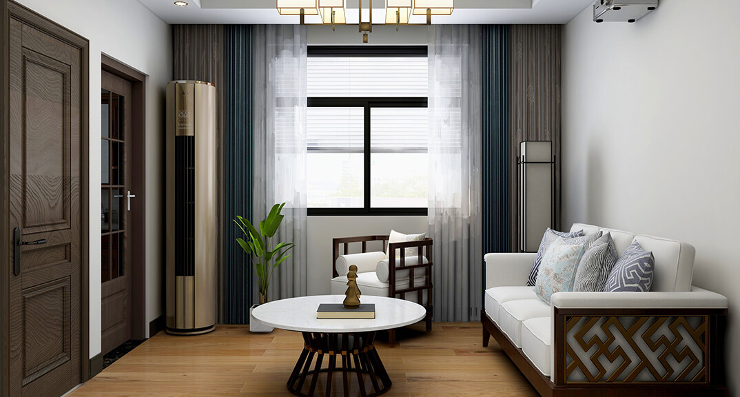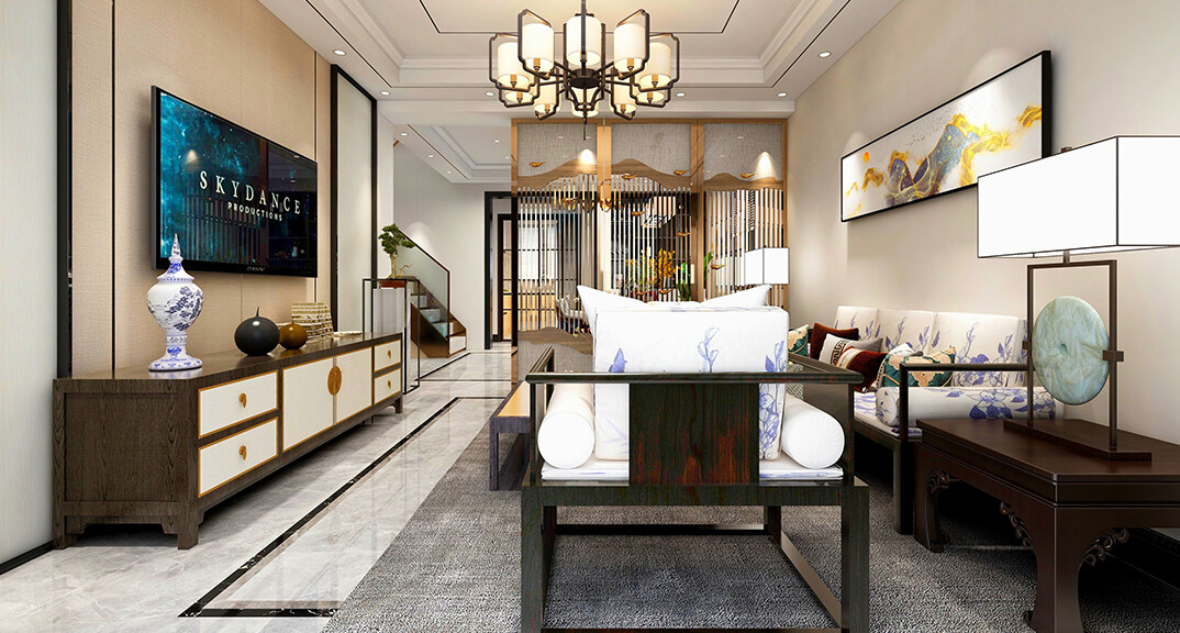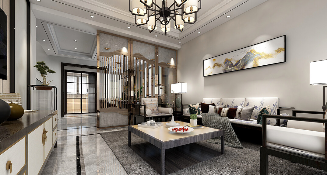 楓林小鎮(zhèn)160㎡聯(lián)排別墅客廳新中式風格裝修案例效果圖
