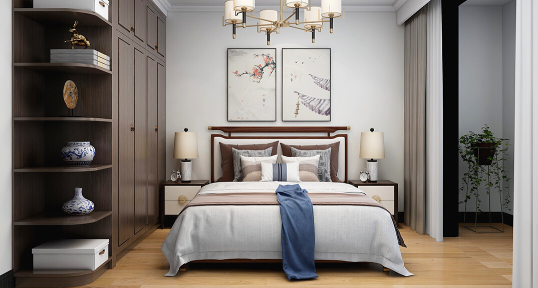 楓林小鎮(zhèn)160㎡聯(lián)排別墅主臥新中式風格裝修案例效果圖