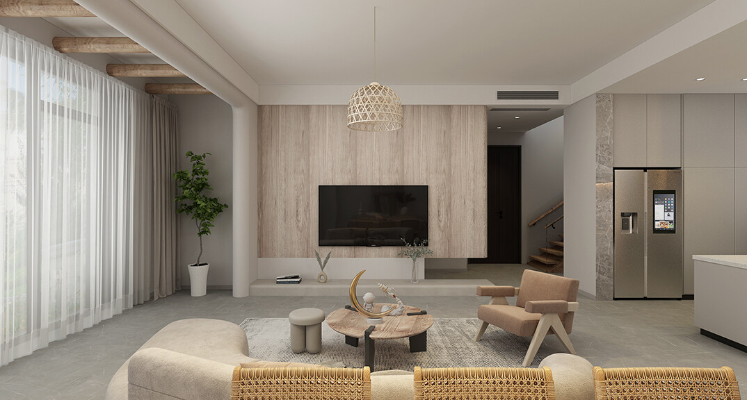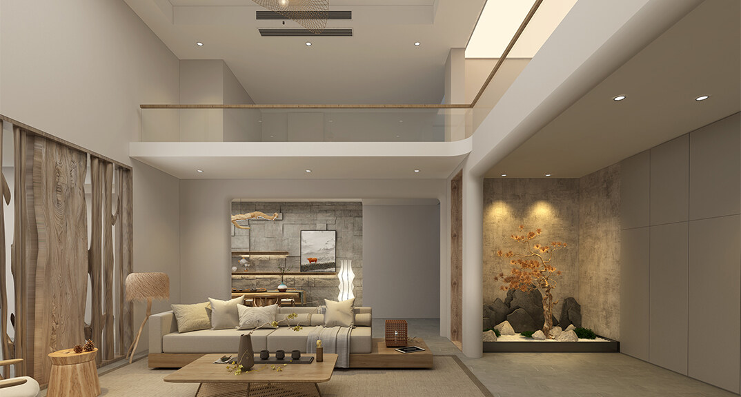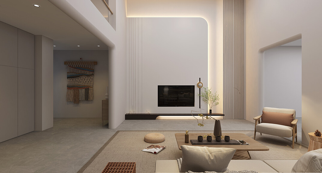 融創(chuàng)紅島壹號院207㎡別墅客廳侘寂風(fēng)格裝修案例效果圖