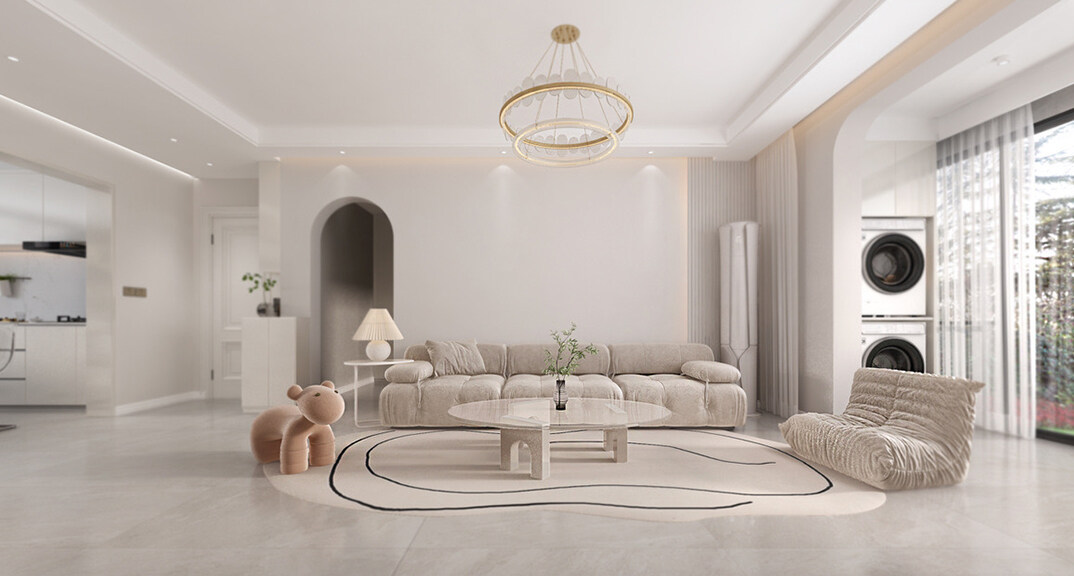 客廳整體空間以奶油白色系搭配淺色系家居,在自然光和暖光燈的照射下,呈現(xiàn)簡約卻不簡單的質(zhì)感空間
