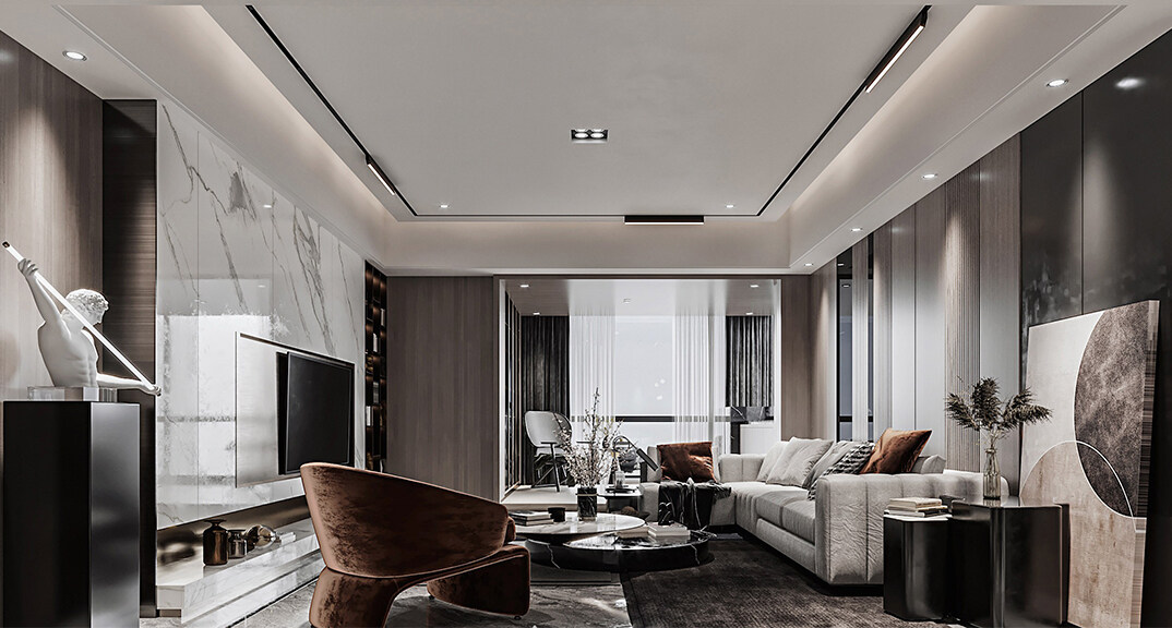 本案設(shè)計風(fēng)格為意式輕奢,拒絕了濃烈的色彩,以一種簡單、純粹的設(shè)計語言,回歸生活的本質(zhì),留存給居住者更多生活想象的空間。 整體空間灰橙色、駝色、與淺暖灰色調(diào)展現(xiàn)輕奢低調(diào)的高級質(zhì)感,簡約時尚的家具又增添了一份現(xiàn)代感,重新梳理了空間功能和尺寸,客廳陽臺一體化設(shè)計,最大限度引入自然光,高級灰搭配中性色系木飾面,打造一個舒適的高品質(zhì)空間。在空間設(shè)計與色彩配搭上,精準地把控節(jié)奏,用設(shè)計表達空間的包容性,更多的是通過人性化思考,創(chuàng)造一個功能性完整的舒適生活空間。大塊的木飾面、金屬元素和燈 光的碰撞搭配,凸顯出強大張力,共同打造出意式輕奢腔調(diào)十足的時尚與質(zhì)感。