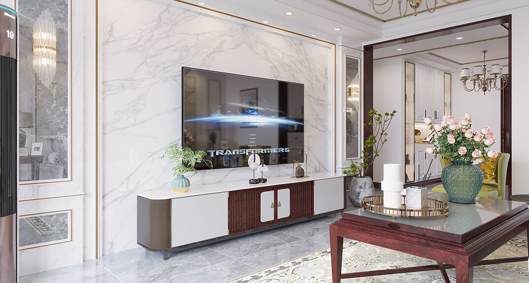 客廳采用簡(jiǎn)潔的石膏裝飾線條吊頂,搭配精致的吊燈,營(yíng)造出一種浪漫的感覺(jué)。以大理石作為電視背景墻和地面裝飾材料,光澤感極佳,在沙發(fā)區(qū)鋪上大幅棕灰色地毯,使空間區(qū)域劃分更加清晰。沙發(fā)運(yùn)用灰色調(diào)與地面顏色相呼應(yīng),拉大了空間感,搭配白色的墻面,襯托出獨(dú)具一格的知性魅力。
