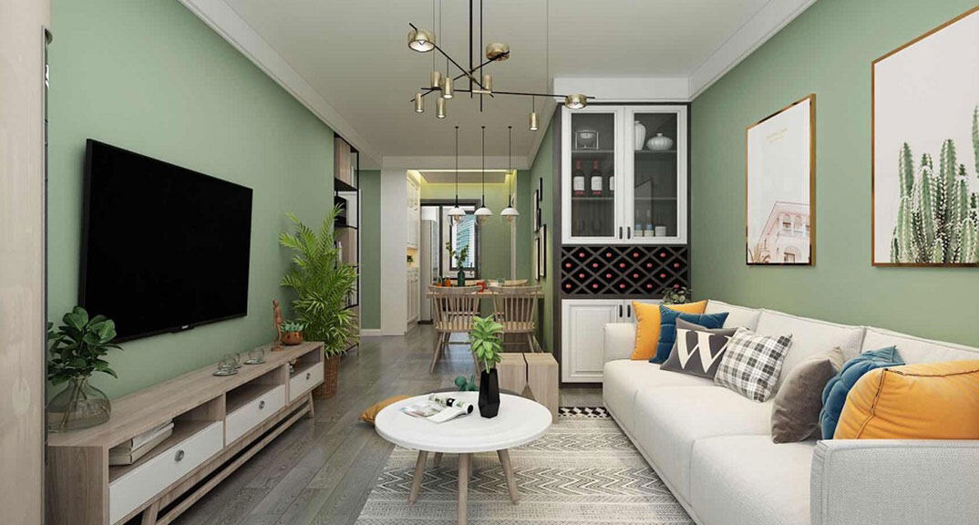 本案例使用薄荷綠色的墻面顏色與灰色的沙發(fā),搭配白色石材臺(tái)面的餐桌,使得整個(gè)空間更加和諧與清新,簡(jiǎn)潔明快的色調(diào)和大氣的視覺感受給人們帶來最直觀的表達(dá)。沙發(fā)旁綠色植物,是現(xiàn)代與自然元素的結(jié)合,讓家居生活更加輕松隨性。