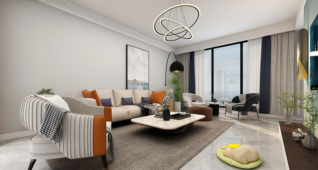 以現(xiàn)代風(fēng)格為主調(diào),主要色彩是米色、淺咖色、白色。在總體布局方面滿足寬敞明亮的需求,注重居室空間的布局與使用功能的完美結(jié)合。整體簡約又不失設(shè)計(jì)感,開放式布局空間聯(lián)通,動線流暢??蛷d米灰色系的沙發(fā),造型簡約,搭配材質(zhì)柔軟的軟裝,使客廳充滿閑話自在的空間氛圍。