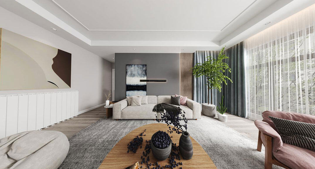 以現(xiàn)代風(fēng)格為主調(diào),主要色彩是米色、淺咖色、白色。在總體布局方面滿足寬敞明亮的需求,注重居室空間的布局與使用功能的完美結(jié)合。整體簡約又不失設(shè)計(jì)感,開放式布局空間聯(lián)通,動線流暢??蛷d米灰色系的沙發(fā),造型簡約,搭配材質(zhì)柔軟的軟裝,使客廳充滿閑話自在的空間氛圍。