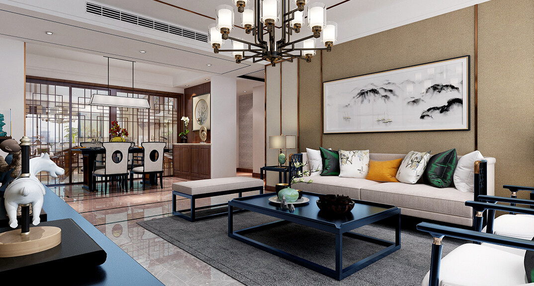 安泰悅湖灣138㎡三室兩廳客廳沙發(fā)新中式風(fēng)格裝修案例效果圖