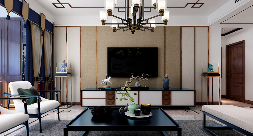 安泰悅湖灣138㎡三室兩廳客廳電視新中式風(fēng)格裝修案例效果圖