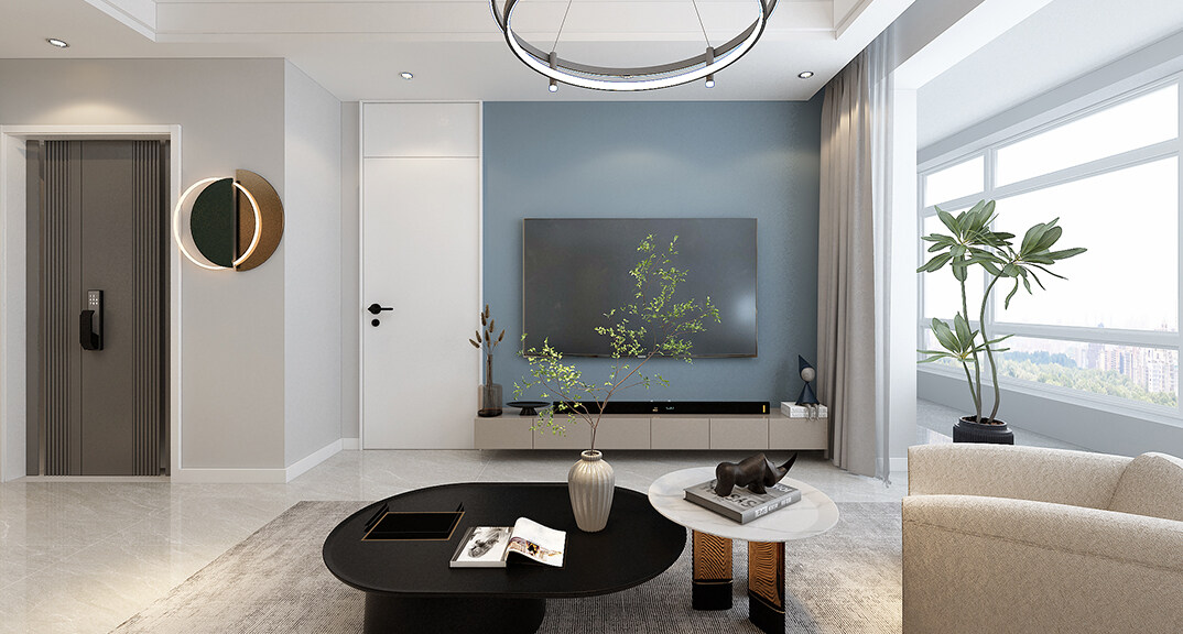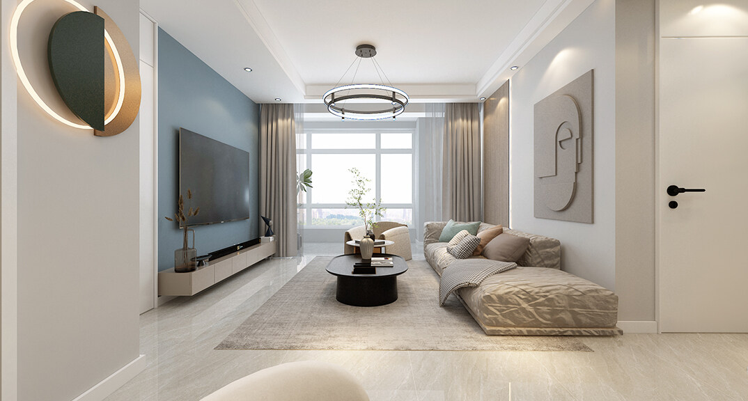 越秀天悅海灣97㎡三室一廳客廳電視現(xiàn)代輕奢風格裝修案例效果圖