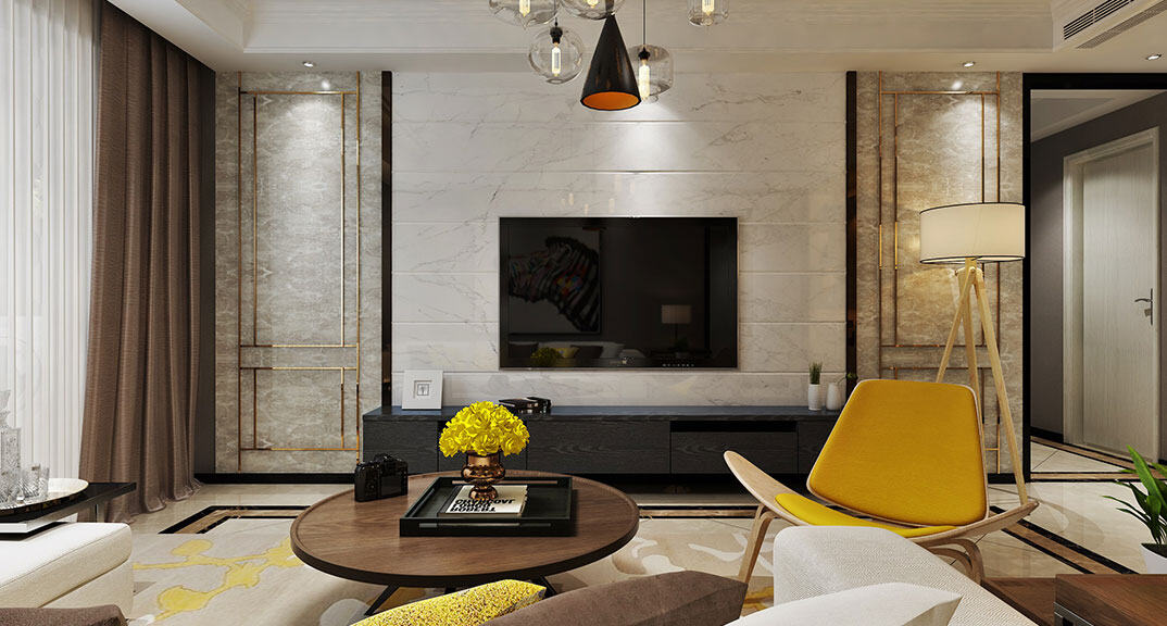 閱海府邸105㎡三室兩廳客廳電視輕奢風(fēng)格裝修案例效果圖