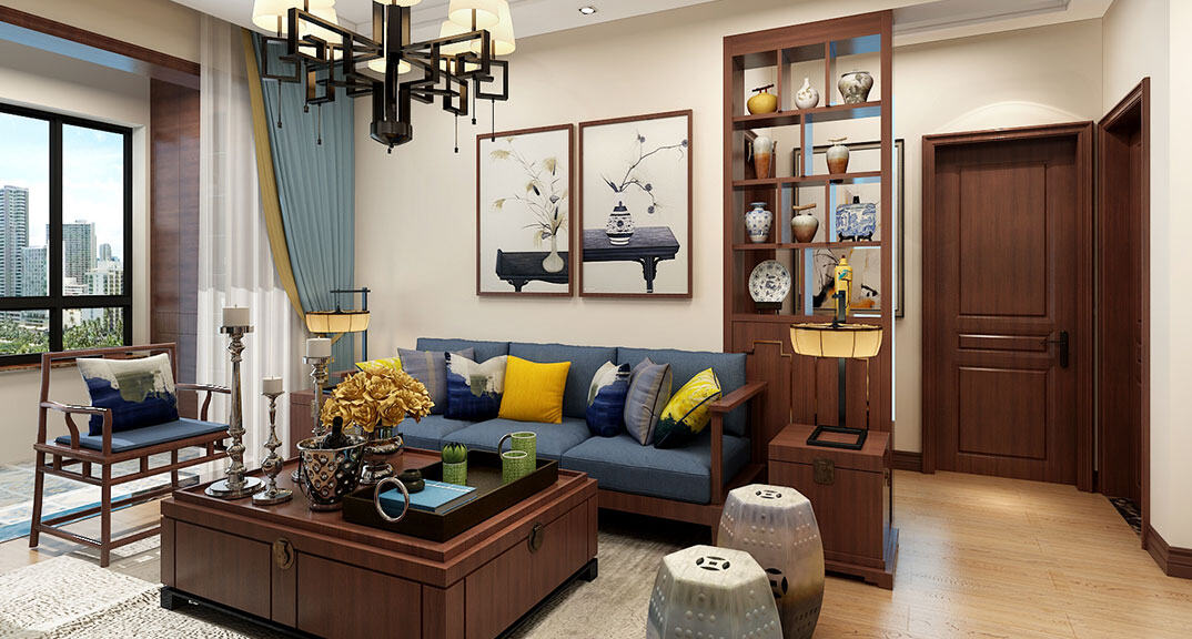 御景新苑90㎡兩室兩廳客廳沙發(fā)新中式風(fēng)格裝修案例效果圖