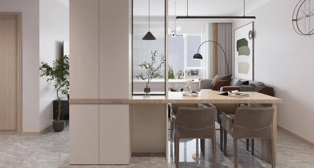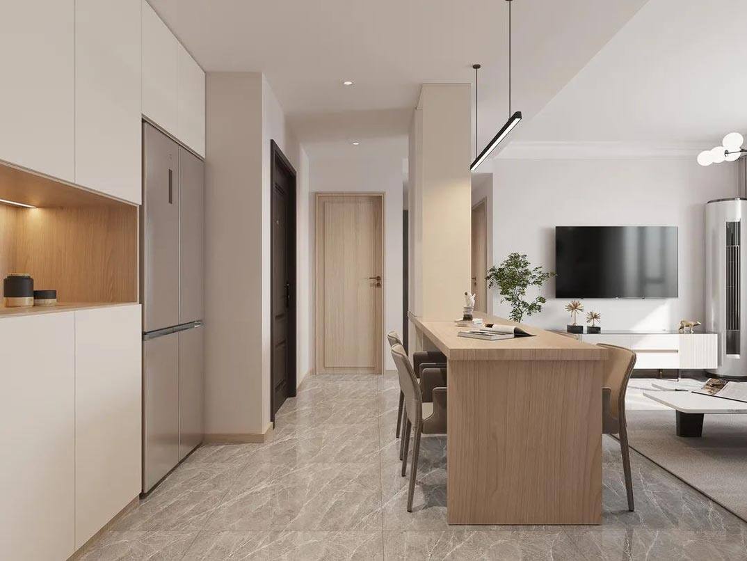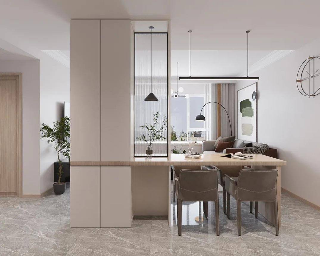 以簡潔、清晰和功能性為特征的室內(nèi)設(shè)計(jì);它主要強(qiáng)調(diào)了空間的簡化和精煉,追求線條簡單、空間通透、色彩明亮、材質(zhì)自然等特點(diǎn),注重形式與功能的結(jié)合。他們希望有一個(gè)時(shí)尚、現(xiàn)代的功能性空間,在整個(gè)空間的設(shè)計(jì)上用了暖灰調(diào)來與簡約的線條感來相呼應(yīng),能改造出一個(gè)通透、流暢的空間感。