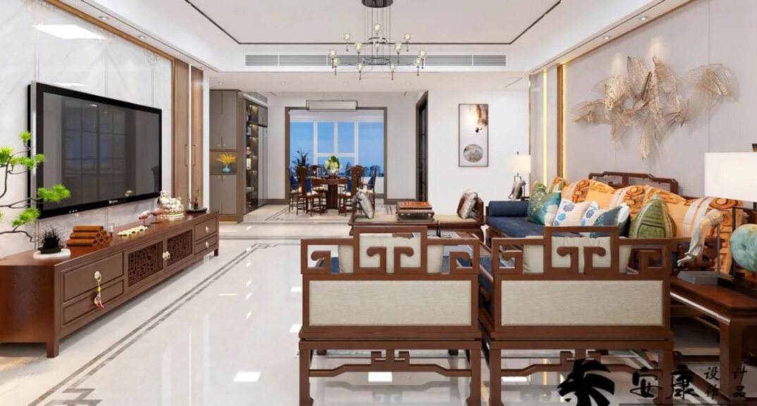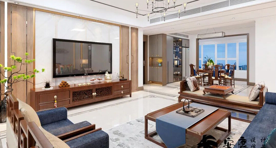 金域瀾庭180㎡四室兩廳客廳電視背景墻新中式風格風格裝修案例效果圖
