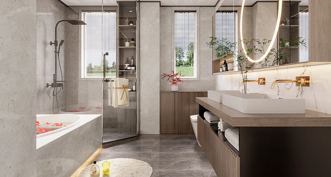 嶗山官邸1000㎡別墅二樓主衛(wèi)新中式風(fēng)格裝修案例效果圖