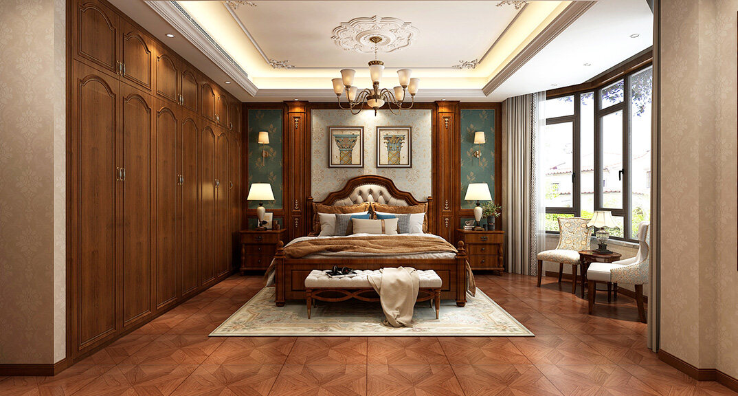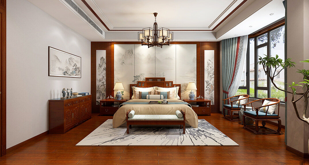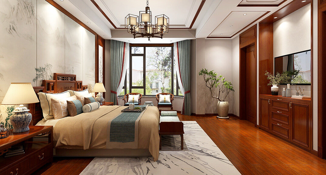 嶗山官邸1000㎡別墅三樓主臥新中式風(fēng)格裝修案例效果圖