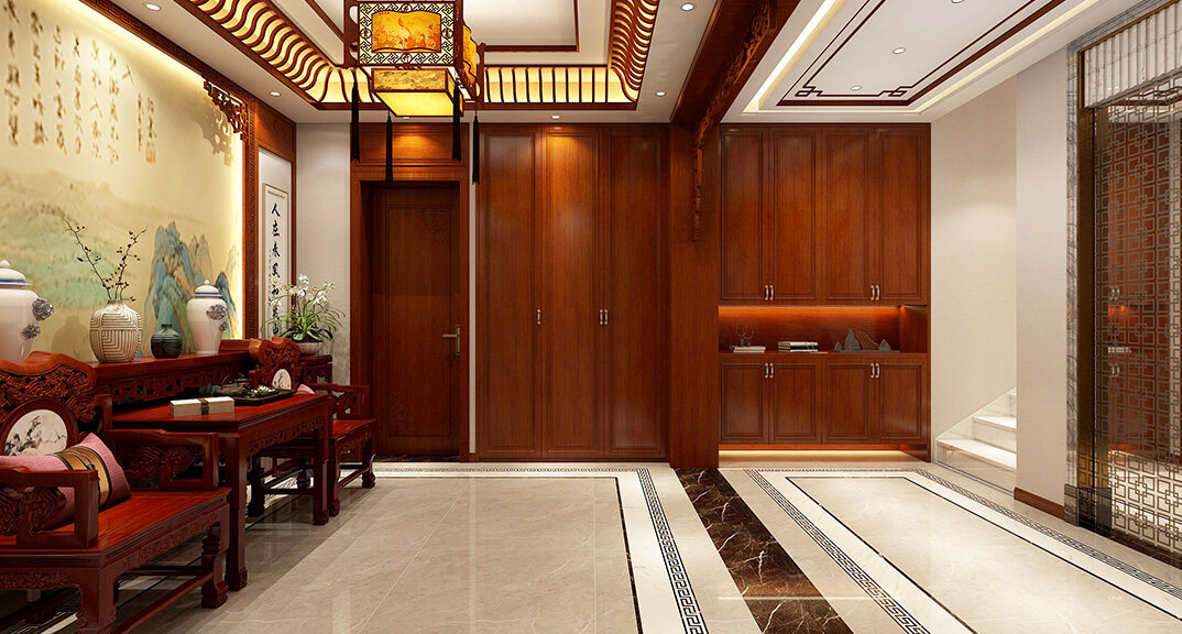 嶗山官邸1000㎡別墅二樓衣帽間新中式風(fēng)格裝修案例效果圖