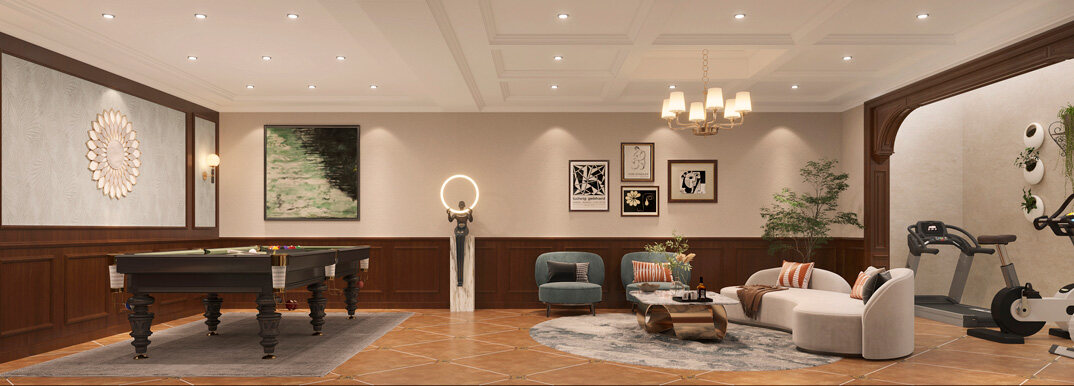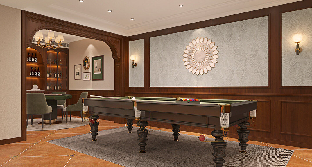 嶗山官邸1000㎡別墅負(fù)一層臺球區(qū)新中式風(fēng)格裝修案例效果圖