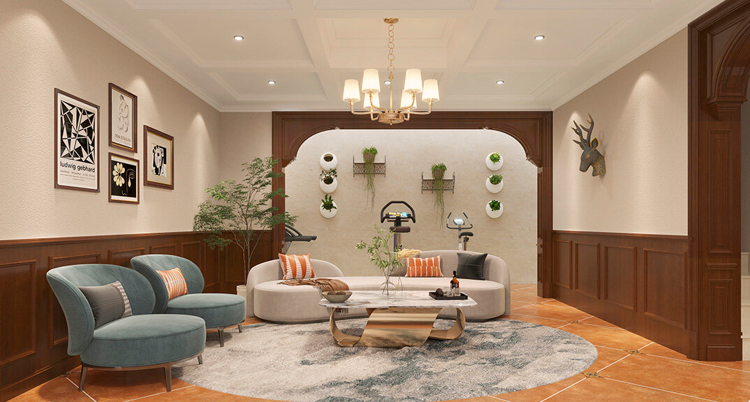嶗山官邸1000㎡別墅負(fù)一層休閑區(qū)新中式風(fēng)格裝修案例效果圖