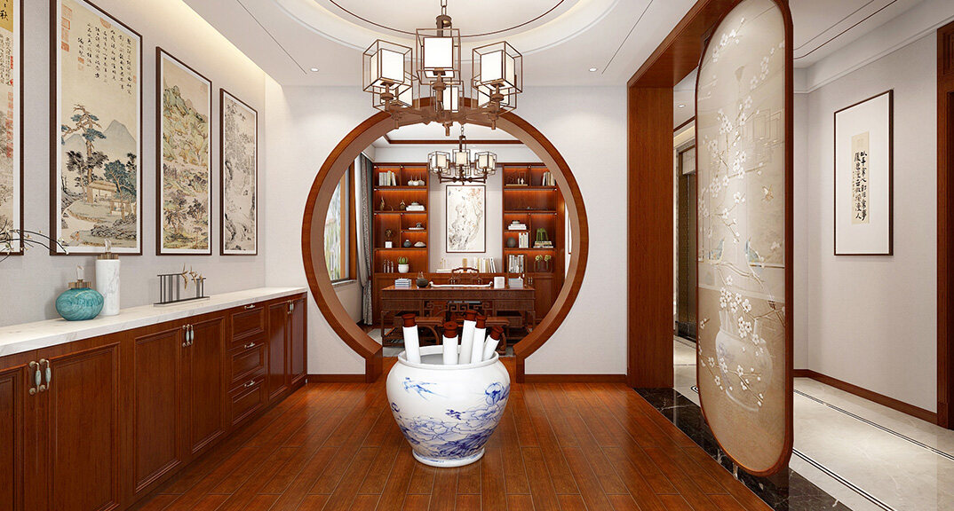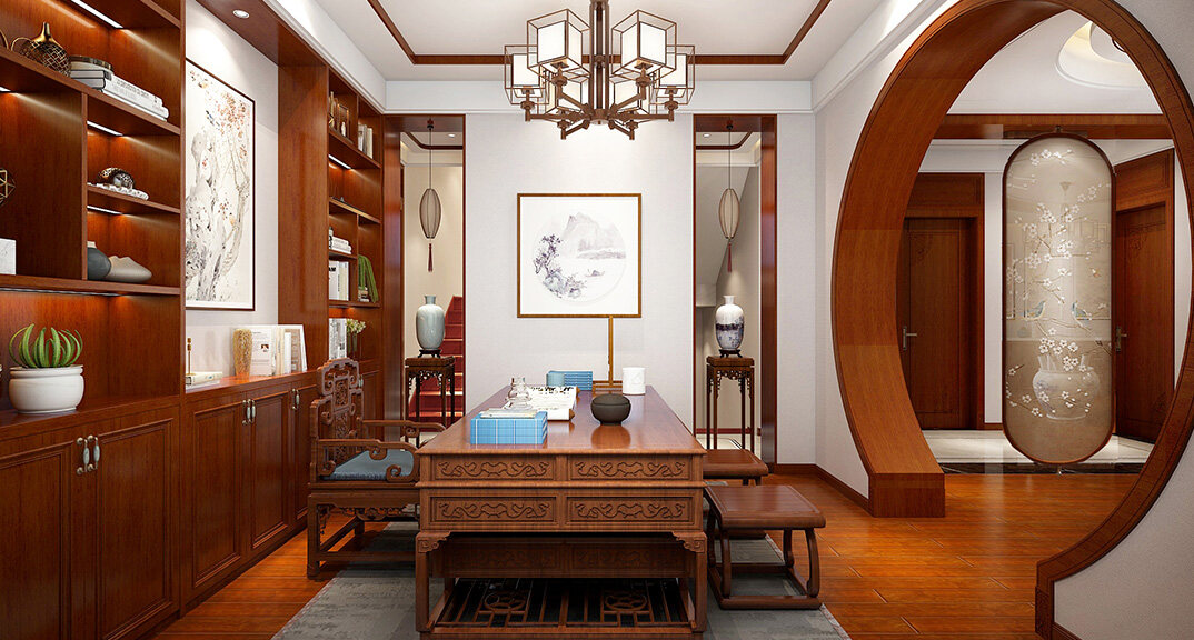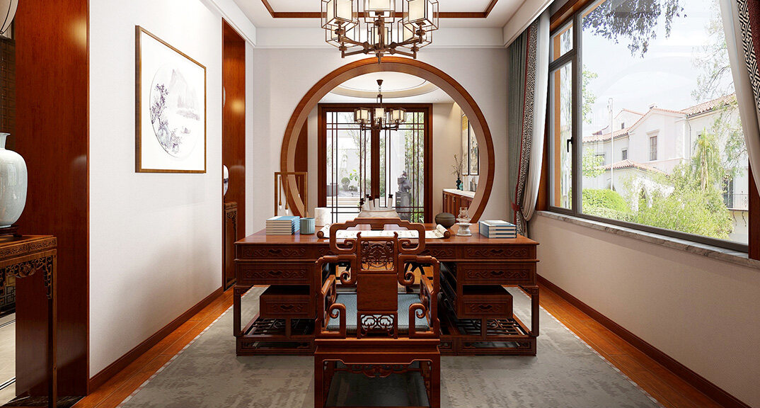 嶗山官邸1000㎡別墅三樓書房新中式風(fēng)格裝修案例效果圖