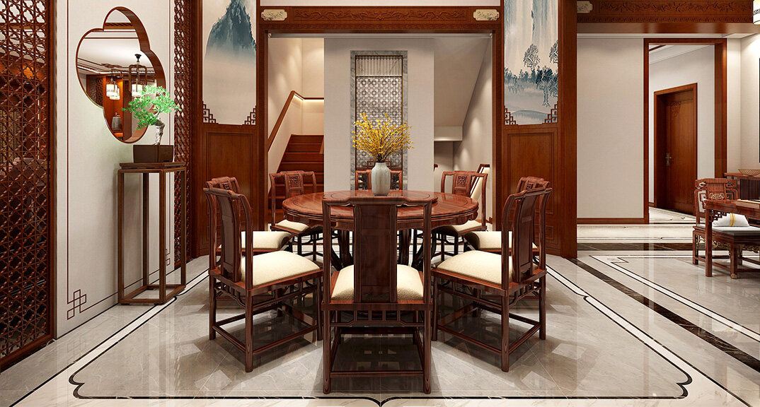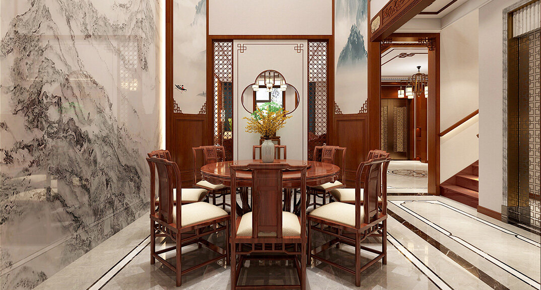 嶗山官邸1000㎡別墅一樓餐廳新中式風(fēng)格裝修案例效果圖